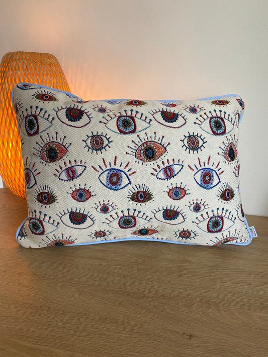 All eyes on you kussen met lichtblauwe bies